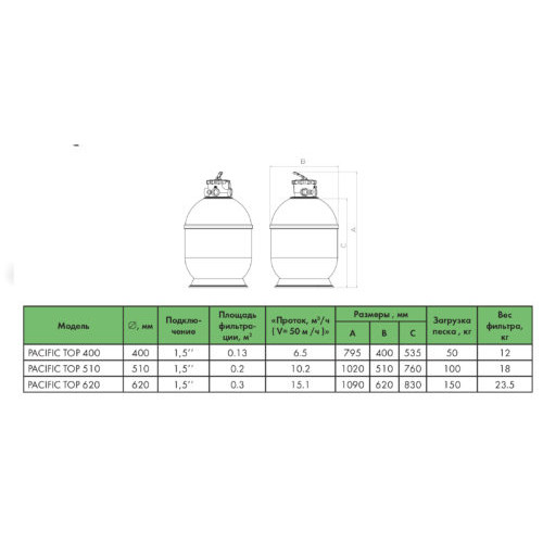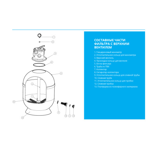 Фильтр для частных бассейнов c верхним 6-позиционным клапаном. Изготовлен по промышленным стандартам. Усиленный стекловолокном, стойкий к ультрафиолетовому излучению. В комплект входит манометр ,6-позиционный клапан.