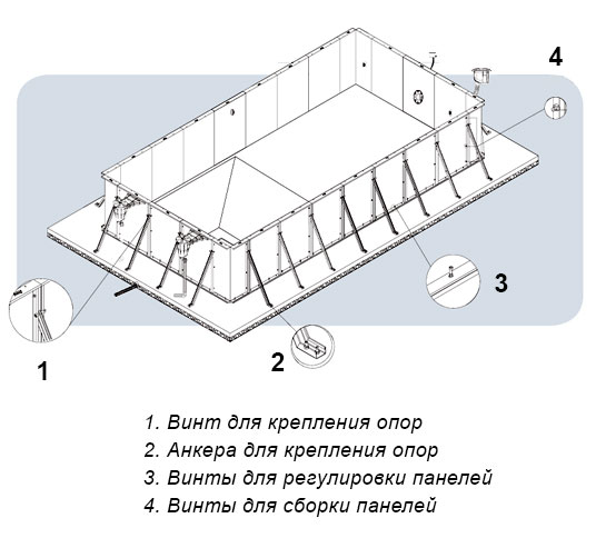 • В панелях подготовлены предварительные ( глухие ) отверстия под закладные элементы (скиммеры, фары, форсунки).
