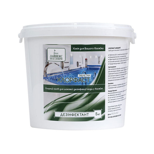 «Хлорфаст-быстрый» - Быстрорастворимые таблетки для обеззараживания воды в бассейне. Одна таблетка 20 г содержит до 12 г активного хлора (55-60%). Эффективно уничтожает бактерии, вирусы, грибки, плесень и водоросли. Не образует осадка. Как правило, применяются для шокового хлорирования, но могут использоваться и для периодической обработки. Препарат очень активен - практически весь активный хлор при растворении переходит в свободную форму и участвует в процессах обеззараживания и окисления. Не содержит извести. Формула препарата позволяет использовать его в воде любой жесткости.