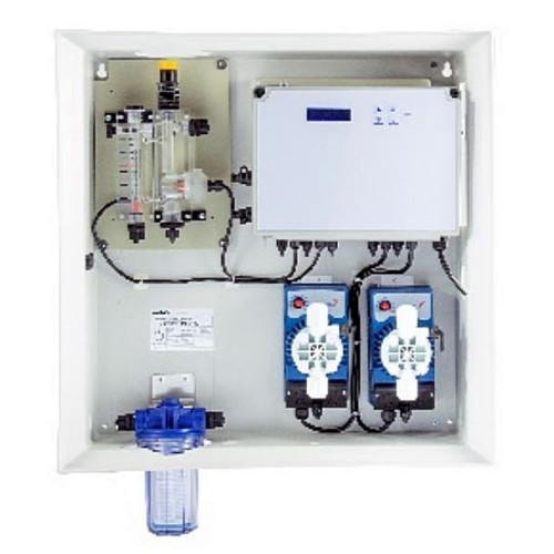 Автоматическая измерительно-дозирующая станция, смонтированная на панели, в комплекте с двумя дозирующими насосами мембранного типа производительностью 5 л/ч при 8 бар. Измерение pН и свободного хлора. Автоматическое пропорциональное дозирование.