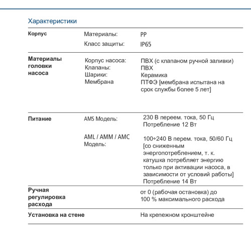 Постоянное значение расхода устанавливается вручную по шкале на передней панели, два диапазона расхода:• 0÷20%, когда переключатель в положении Р,• 0÷100%, когда переключатель в положении С,Светодиодный индикатор включения питания и вход контроля уровня.