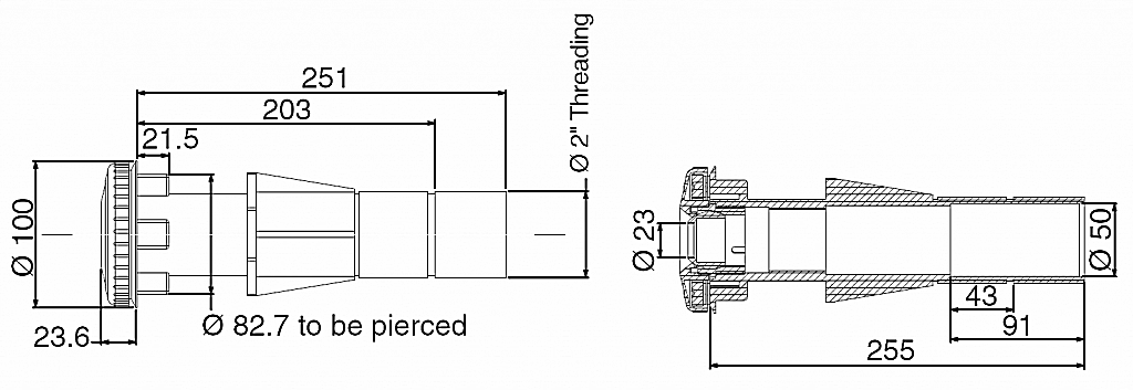 Стеновой проход с форсункой и соплом TP-270, 250 мм оснащен специальным бортиком, который препятствует попаданию воды вдоль корпуса фитинга.