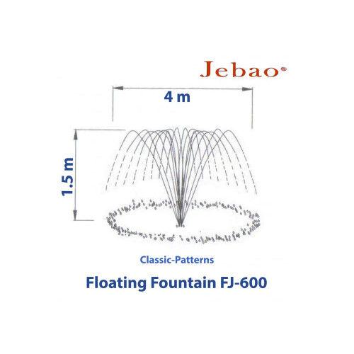 При помощи разных насадок можно создать разные формы и размеры водных потоков. Примеры фонтанов с размерами и возможными водными узорами показаны на картинках к данной модели Jebao FJ-600. Выбор и установка узора осуществляется индивидуально без возможности автоматической смены насадок.