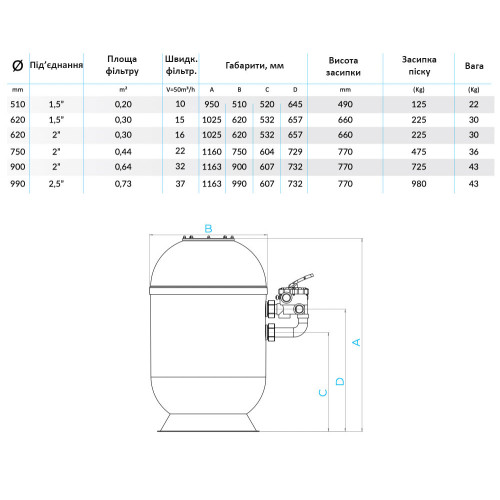 1 1/2” 6-ходовой клапан для диам. 510 и 620 мм, 2” для диам. 750 и 900 мм,!!! 2.5” для діам. 990 мм. ( * Клапан замовляється окремо ) !!!Модель диам. 620 может комплектоваться с 2” клапаном.Главные Особенности: