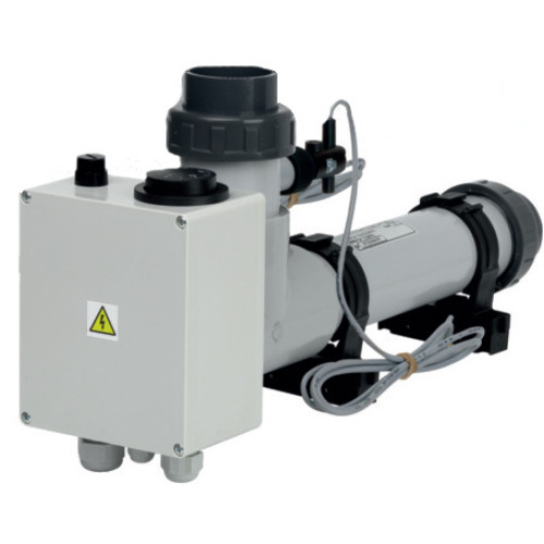 Компактный электронагреватель Vagner для нагрева воды в бассейне. Корпус из термостойкого пластика , ТЭН из титана. В комплекте с термостатом, реле протока.