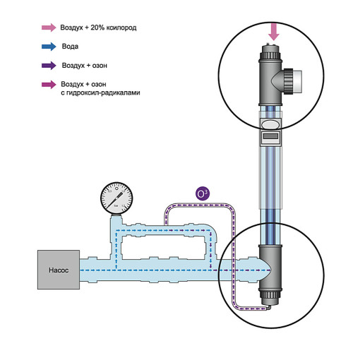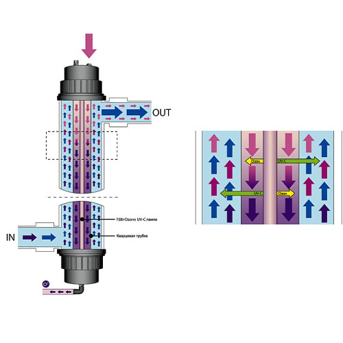 За счет разности давлений в камеру через трубку вентури всасывается воздух. Давление в реакционной камере можно контролировать по манометру и регулировать шаровым краном.Оптимальное давление составляет от 0.4 до 0.7 бар. Воздух всасывается в устройство через воздушный клапан, и поступает в зазор между кварцевой трубкой и ультрафиолетовой лампой UV-C озонатора. Проходя мимо специальной озонирующей лампы, воздух обогащается озоном; производительность озонирующей лампы составляет 0.6 грамма озона. Через шаровой кран обогащенный озоном воздух поступает в реакционную камеру, и смешивается с водой. При этом он окисляет органические вещества, и обеззараживает воду, обеспечивая эффективную дезинфекцию. Смесь воды и озона затем подвергается воздействию излучения лампы UV-C, размещенной в корпусе из нержавеющей стали. Эта лампа выполняет две функции, одновременно вырабатывая озон и ультрафиолетовое излучение диапазона UV-C. Выполнив свои функции, молекулы озона разрушаются в воде еще до выхода из устройства.